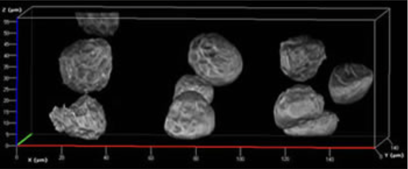 Right: 3D rendering of nuclei stained for LamDm0 in Drosophila tissue, mounted in CFM3 + antifade, imaged via confocal microscopy. Notice the staining intensity is consistent throughout the entire 55µm stack with no increase in spherical aberration.